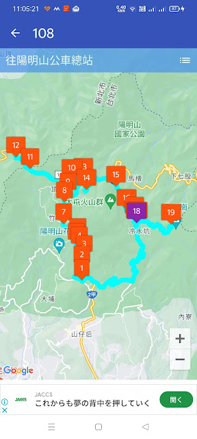 実は、「路線規劃」(発地-目的地から路線検索)で調べると、台北市街のどこかから陽明山站へ行き、108に乗り換える候補もでる。バスの乗り換えが苦にならないなら、そういう方法もある。